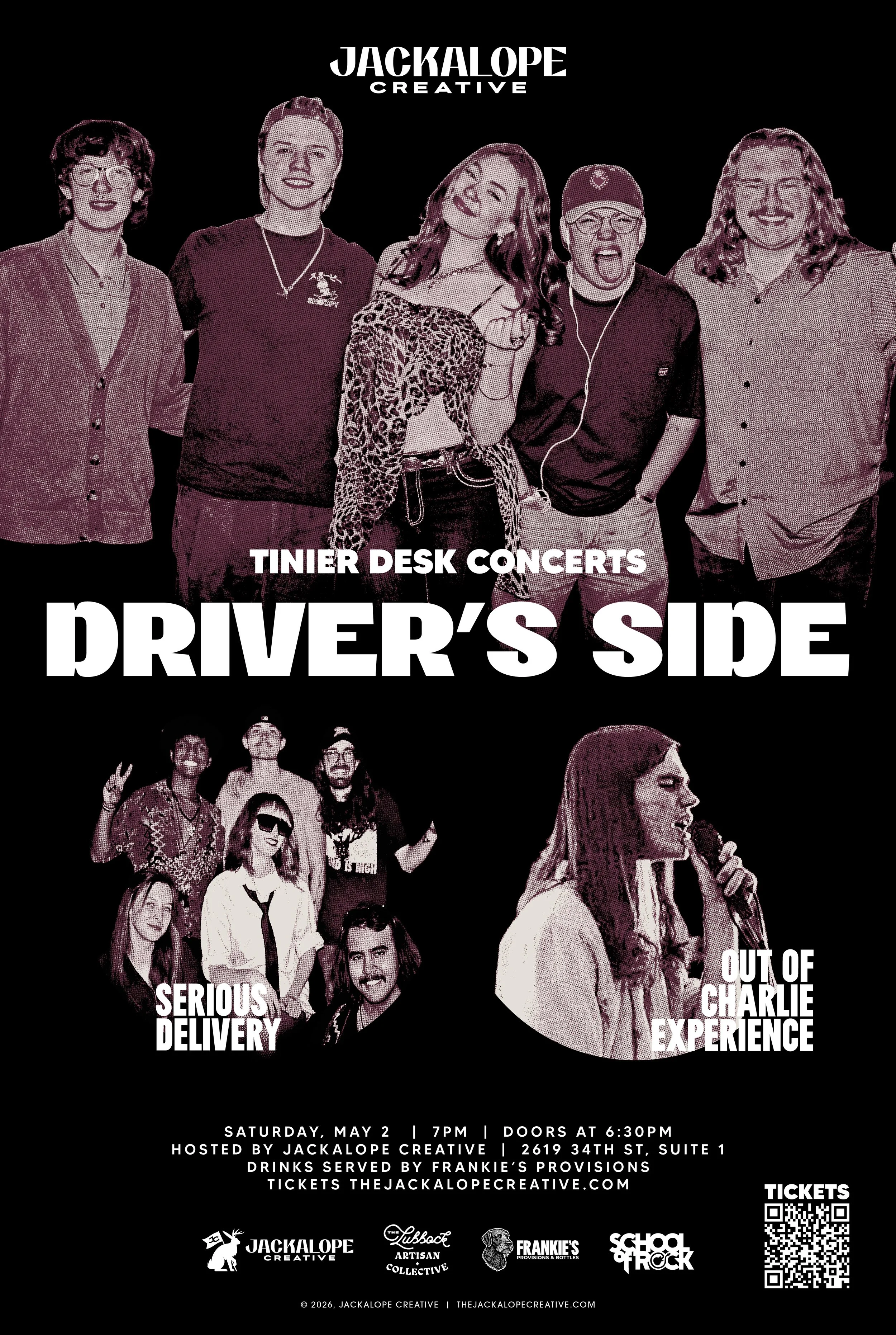 Tinier Desk Concert at Jackalope Creative on May 2 for an office-turned-venue show featuring Driver's Side, Serious Delivery, and Out of Charlie Experience.